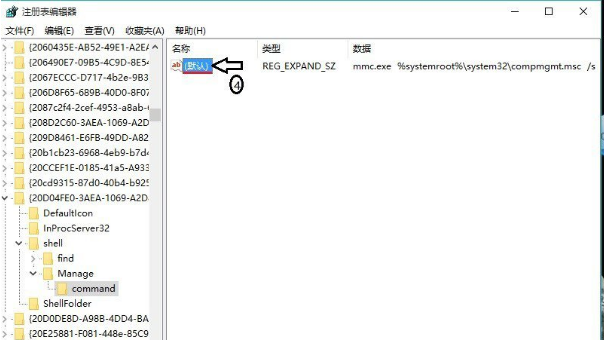 5、在弹出”注册表“对话框中依次选择”HKEY_LOCAL_MACHINE““SOFTWARE”“Classes”“CLSID”“20D04EF0-3AED-1069-A2D8-08002B30309D”“shell”“Manage”“command”,双击”默认“按钮;