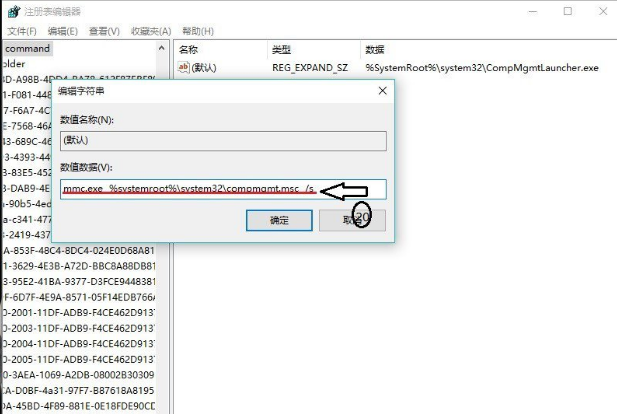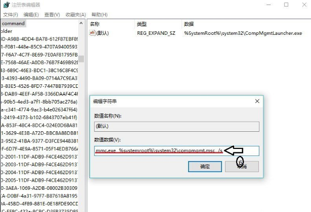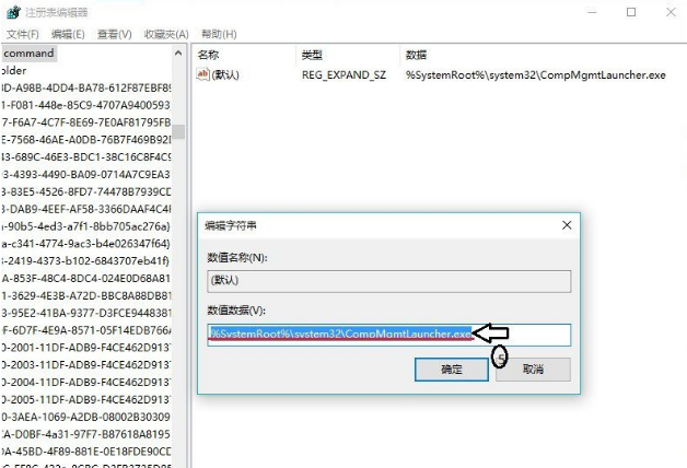 6、在弹出”编辑字符串“的对话框中,更改”%SystemRoot%\\systme32\\CompMgmtLaucher.exe“更改为”mmc.exe %systemroot%\\system32\\compmgmt.msc /s“,若是更改成功,则修复故障成功;若是弹出以下对话框(如第3图),则应更改相关配置,更改权限来更改,其过程如下;