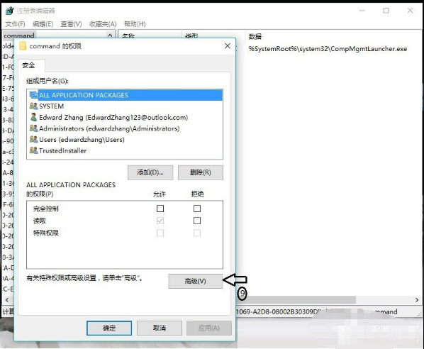 8、在弹出的”command权限“对话框中,单击”高级“;