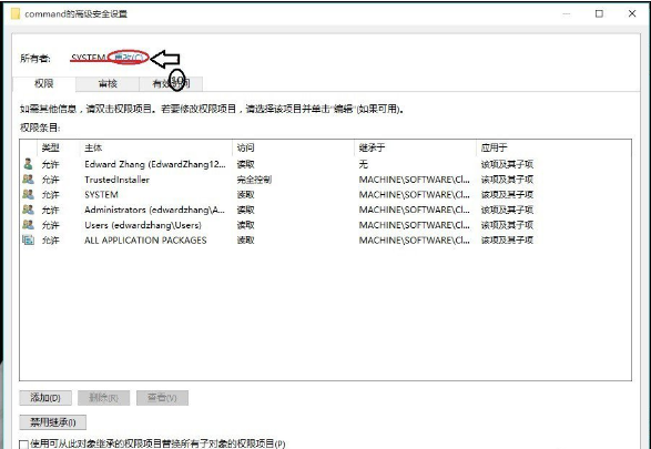 9、在弹出的”command的高级安全设置“对话框中,单击”更改“;