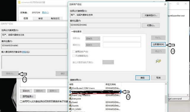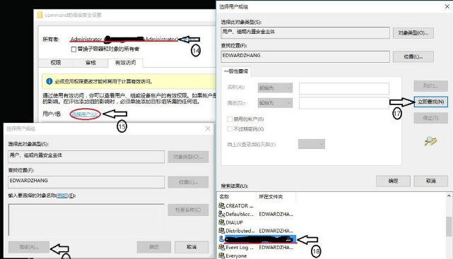 11、选择”有效访问“单击”选择用户“在弹出的”选择此对象类型“单击”高级“,在弹出的”选择用户或组“对话框中,单击”立即查找“按钮,双击自己电脑的用户名,更改自己使用账户的权限为”完全控制“;