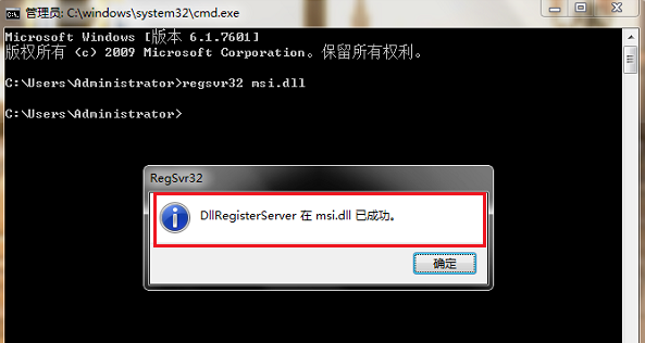 按回车键之后,我们可以看到DllRegisterServer在msi.dll已成功,如下图所示,