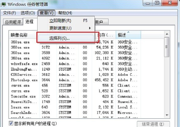 如果我们想看各个程序使用CPU的情况,点击“查看”,选择“选择列”,如下图所示: