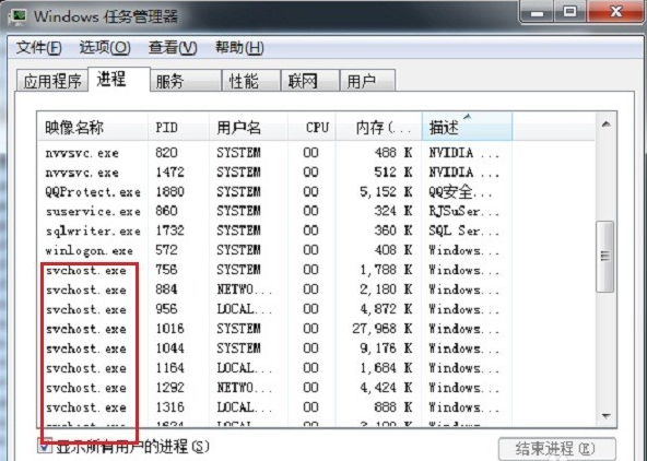 打开任务管理器,结束掉使用CPU高的应用程序,但是有一些进程不能结束掉,可能会造成计算机重启,如svchost.exe等,如下图所示: