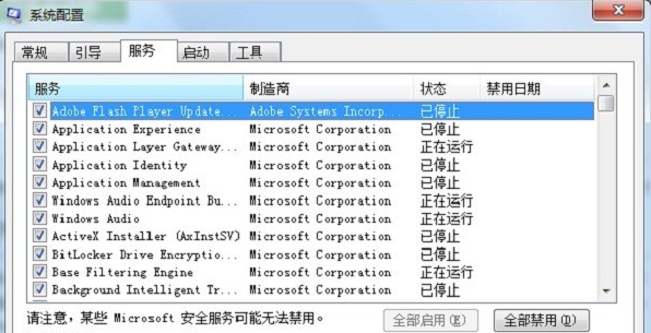 3、点击“服务”,关闭一些后台服务项目,如下图所示: