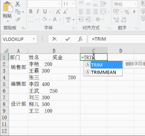 Trim函数,删除字符串首尾的空白,保留字符串内部作为词与词之间分隔的空格。