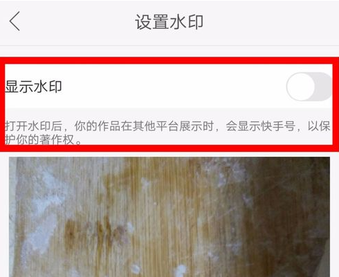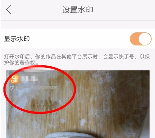 可以看到系统的提示,打开水印开关后,你的作品在其他平台显示时,会显示你的快手号,保护你的著作权!我们选择打开水印开关!