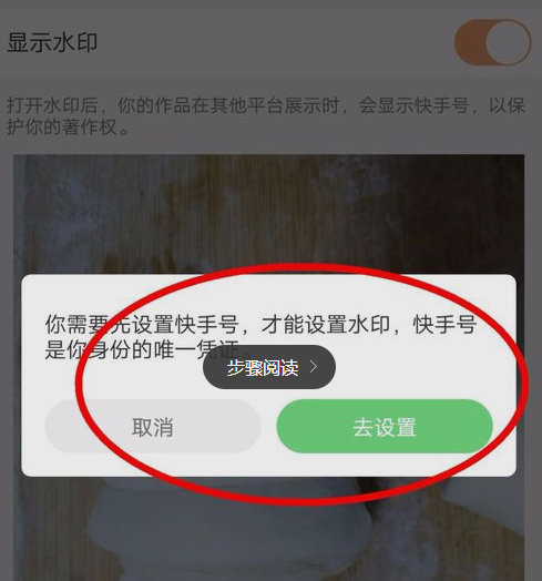 这个时候系统会提示你先设置快手号才可以成功打开水印开关。我们点击去设置即可。(快手号以前设置了的话就不需要此步骤了!)