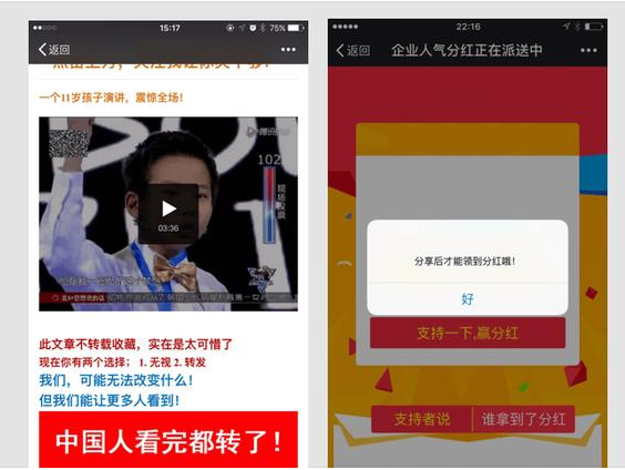 通过利益诱惑来诱导用户我来教你公众号文章,或者传播外链内容。这个利益可能是红包,返现,积分,抽奖等。最坑爹的时,你我来教你完,也没有得到任何利益,这就是完完全全全的骗局。