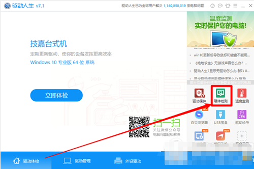 到完美下载站下载驱动人生7,点击右边九宫格上的【硬件检测】。