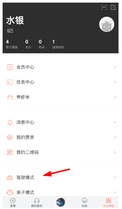 打开虾米音乐APP,点击进入个人页面,从而设置开启驾驶模式。