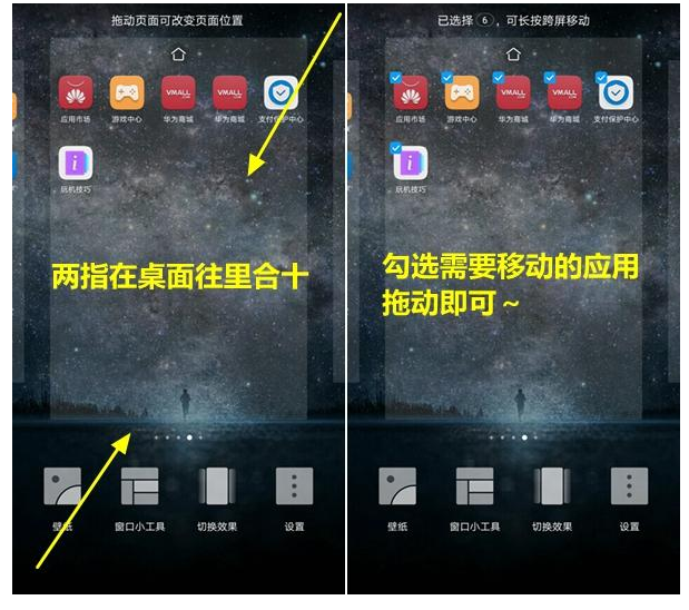在桌面两指合十,选择需要移动的应用,然后移动即可实现瞬间大批量移动应用,是不是很有意思呢?