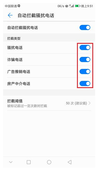 在这里可以进行一系列的设置,例如拦截未知号码、拦截所有陌生人等~我们进入【自动拦截骚扰电话】这一界面,可以设置拦截的类型以及阈值。其中,阈值的默认值为50,大家可以根据各自的需求进行调整:
