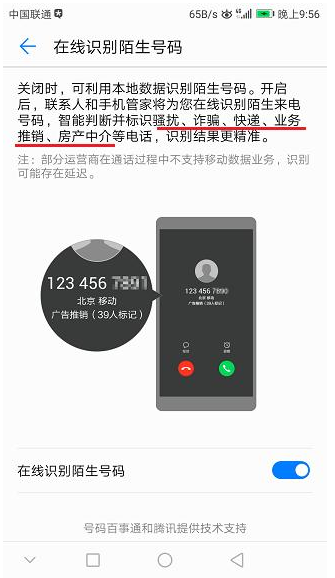 在通话设置中,还隐藏着一个Boss级别的功能:【智能识别陌生号码】,这个功能有什么作用呢?开启后,系统会自动识别拨入的陌生号码,识别后会自动标识其所属类别: