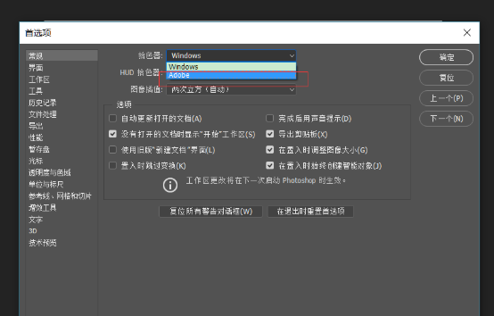 点击常规-拾色器,将‘windows’改为‘Adobe’,这样拾色器就变成了默认的样子,