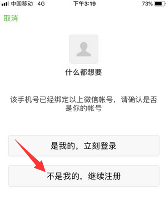 当你看到第二条提示信息,则可选择“不是的,继续注册”按钮,即可使用同一个手机号码在注册微信账号。