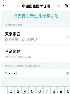 可以选择“单亲家庭/双亲家庭”类型,输入网证密码(需提前到网证机铺点开通)