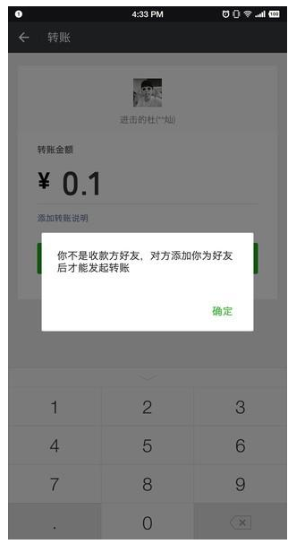 我们可以通过一对一方式来检测好友有没有删除自己——只需要给对方转账(不会真的转钱过去)即可。你打开与对方的聊天界面,选择转账,金额任意,点击“转账”,如果对方删除你了,微信就会提示“你不是收款方的好友,对方添加你为好友后才能发起转账”,如果对方没有删除你,那么微信会提示你输入交易密码。
