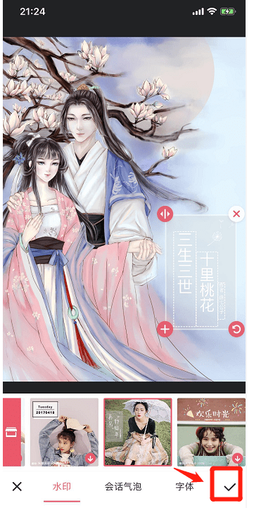 调整文字水印位置到合适的地方,调整完毕后,点击右下角勾勾按钮;