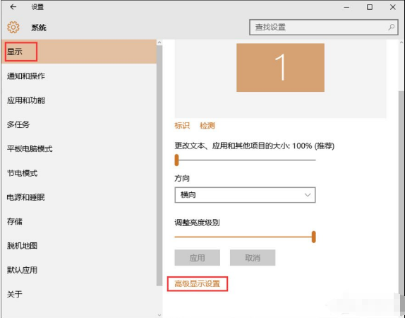 3、点击【系统】功能选项进入系统设置界面,在左侧菜单栏里选择【显示】,并下拉该界面,找到【高级显示设置】功能选项;