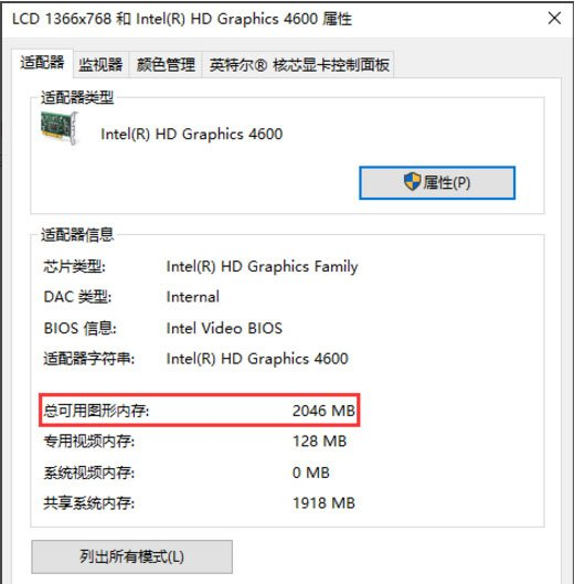 5、点击【显示适配器属性】功能选项,进入显卡属性对话窗口,在该窗口即可查看显卡显存的大小了。
