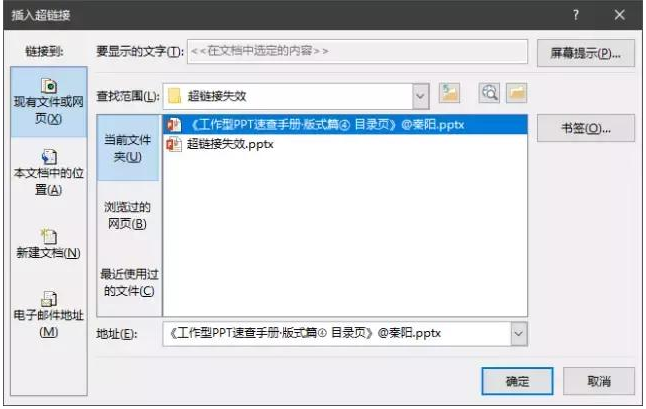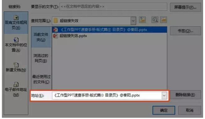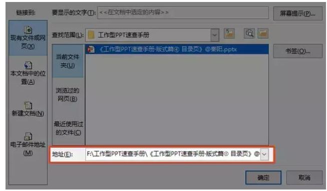 比如我链接至同一文件夹的【工作型PPT速查手册.pptx】文件,下次打开超链接, PPT就会自动在同一个文件夹里找这个文件然后打开。