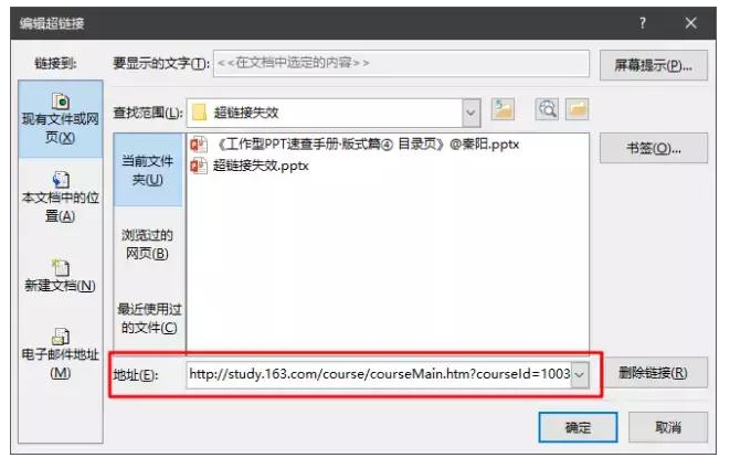 当你插入超链接时,如果选择的链接文件不在PPT的同一个文件夹下时,链接地址栏就会指添加绝对路径。因为只有这样,PPT才找得到这个文件。
