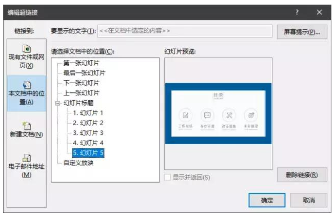 同样的方法,只不过要切换左侧的选项。比如要链接到当前PPT的第5页,那就要在左侧选中【本文档中的位置】,再选择具体的页面指定目标位置: