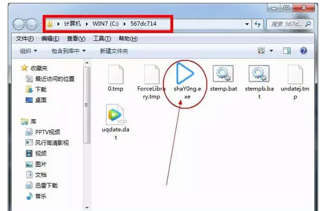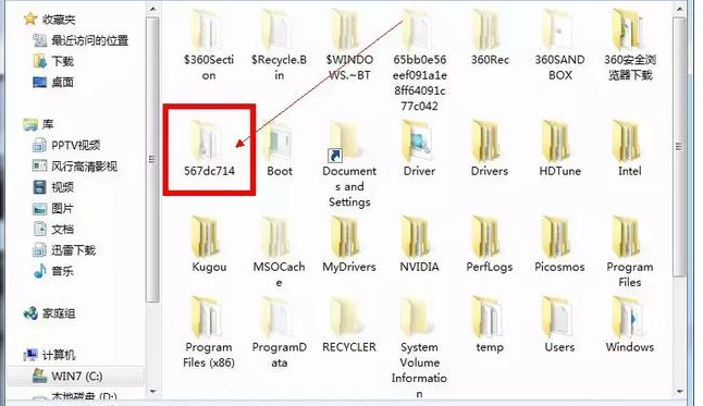 4、我们发现进入的居然是C盘的根目录下的567dc714目录里,并在里面发现这个软件的残留。