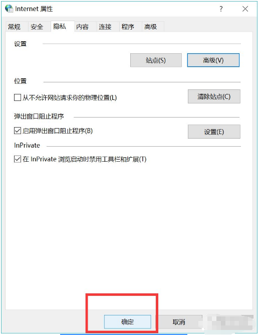 7、切换到刚才的“隐私”页面下再点击“确定”即可,这样就开启cookies了。