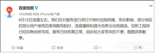 6月12日凌晨左右,我们在对服务进行例行升级时出现故障,受此影响,部分地区的部分用户使用百度地图导航时,语音播报和提示信息会出现错误。目前工程师已经加急抢修完成,服务已经恢复正常,因此给大家带来的不便,图图深表歉意。