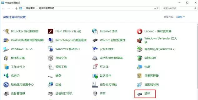 第一步:进入控制面板,找到“鼠标”,如图: