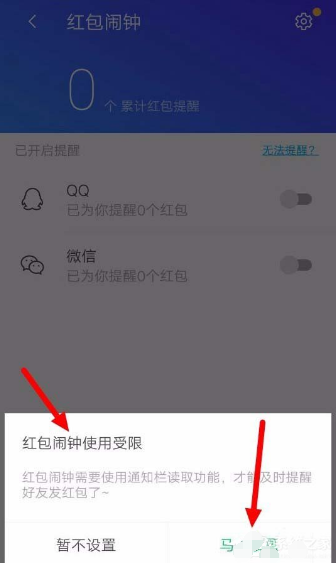 3、系统会提示你红包闹钟功能受限,选择马上去设置。