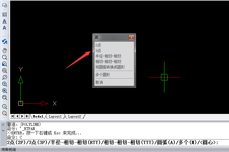2、在命令行输入绘制圆的快捷键C,按回车键,在弹出的对话框中选择【3点】。