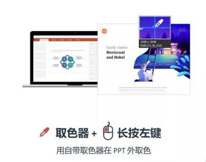 点击取色器后,只需长按鼠标左键就可以取到PPT软件以外的颜色。