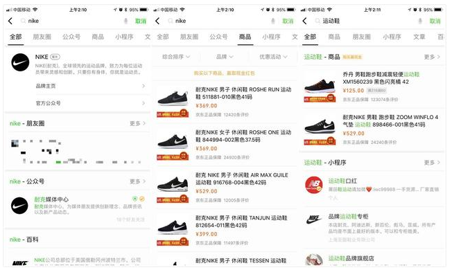 2)已经入驻进京东的品牌商品,直接搜索品牌名称就会出现。但是搜品牌名并不会在默认首页即【全部】一栏里出现商品信息,而【商品】一栏也被排在【朋友圈】和【公众号】之后,排在【小程序】和【文章】等栏目之前。