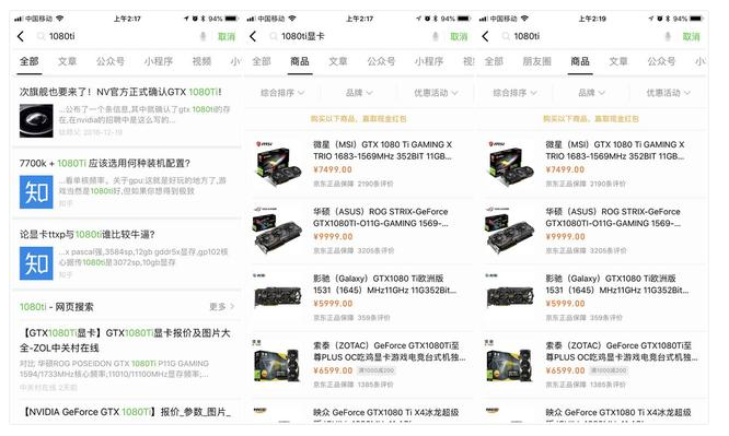 但如果搜索关键词是“1080ti显卡”,系统便认为用户是在搜索一个商品而非内容,会呈现“1080ti显卡”这个小类目下的各品牌商品,与前述大类目搜索类似。