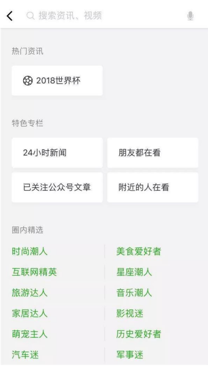 除了“2018世界杯专题”外,“看一看”还新增了个性化板块,让你不出门也能“看世界“。此外,在特色专栏还设有四个入口,分别是24小时新闻、朋友都在看、已请关注公众号文章、附近的人在看!