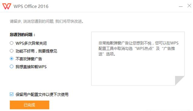 2、在弹出的卸载页面,选择不喜欢弹窗广告。这时候你会发现下面的卸载按钮,变成了关闭广告的按钮,点击。