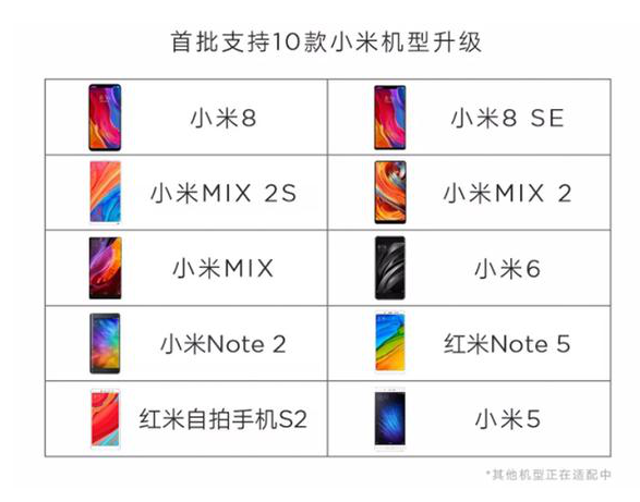 MIUI 10首批机型公测开发版适配机型包括小米8、小米8 SE、小米6、小米5、小米MIX 2S、小米MIX 2、小米MIX、小米Note 2、红米S2、红米Note 5等10款设备。