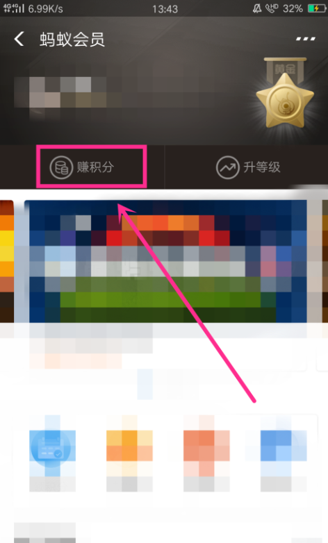 在蚂蚁会员页面中,点击赚积分功能,如图所示,