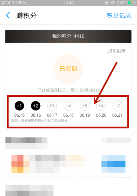 在赚积分页面,点击签到领取积分,以7天为周期,一次递增,如图所示,