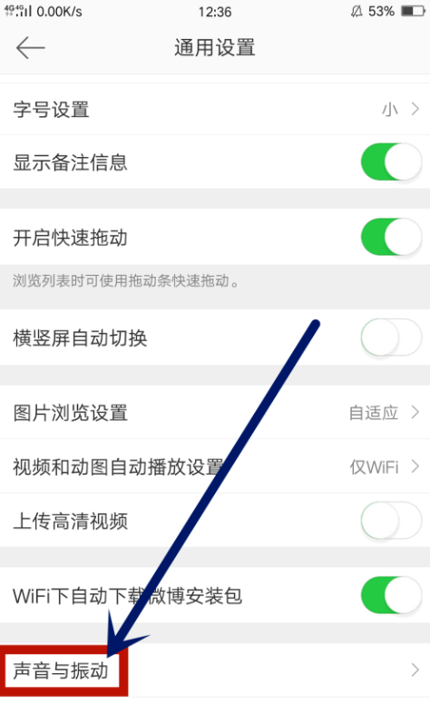 进入微博通用设置后,下翻页面然后点击进入“声音与振动”功能,如图所示,