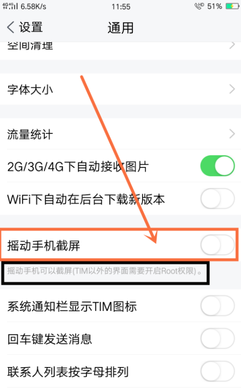 在通用设置中,点击开启摇动手机截屏开关,如图所示,