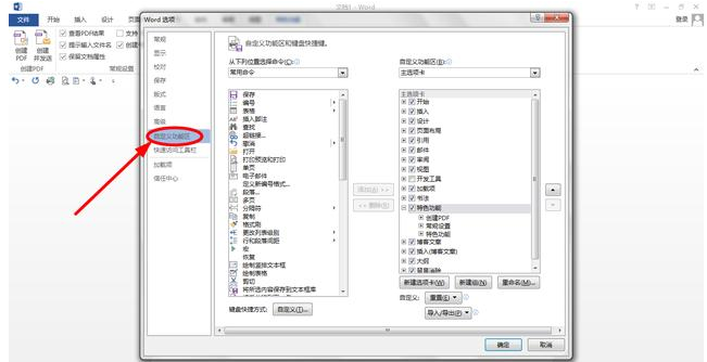 选择“选项”看到如下界面,也可以直接在Word功能区空白处右键,直接选择“自定义功能区”,也可以打开这个页面。然后选择“自定义功能区”。