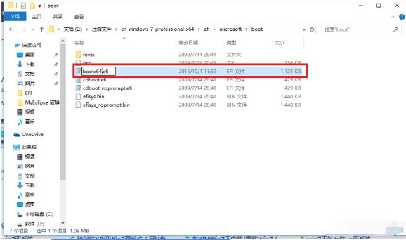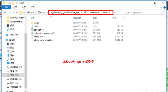3 、随后在你的Win7安装包中根据:efi→microsoft→boot如下图所示。文件夹中无bootmgr.efi文件。