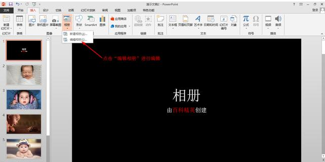打开PowerPoint软件,选择“插入”菜单下的“相册”里的“新建相册”,我用的是PPT2013版本,其他版本也可以的,