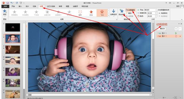 你也可以通过文本框添加文字,动画效果可以通过“动画”进行添加,和普通的PPT制作是一样的,调节转场特效、转场的顺序和时间。