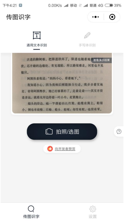 微信小程序现在越发流行了,下面给大家我来教你一个我最近在用的小程序——传图识字。这个小程序可以任意选一张带文字的照片,然后它会抓取文字,你就可以复制这些文字了,方便快捷。