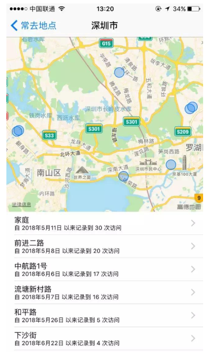 进去之后,手机屏幕会出现一张地图,上面密密麻麻的列出了手机用户经常去的地方,详细到具体的到访时间、地点,以及次数,出现频繁的还会被标注为“家庭”